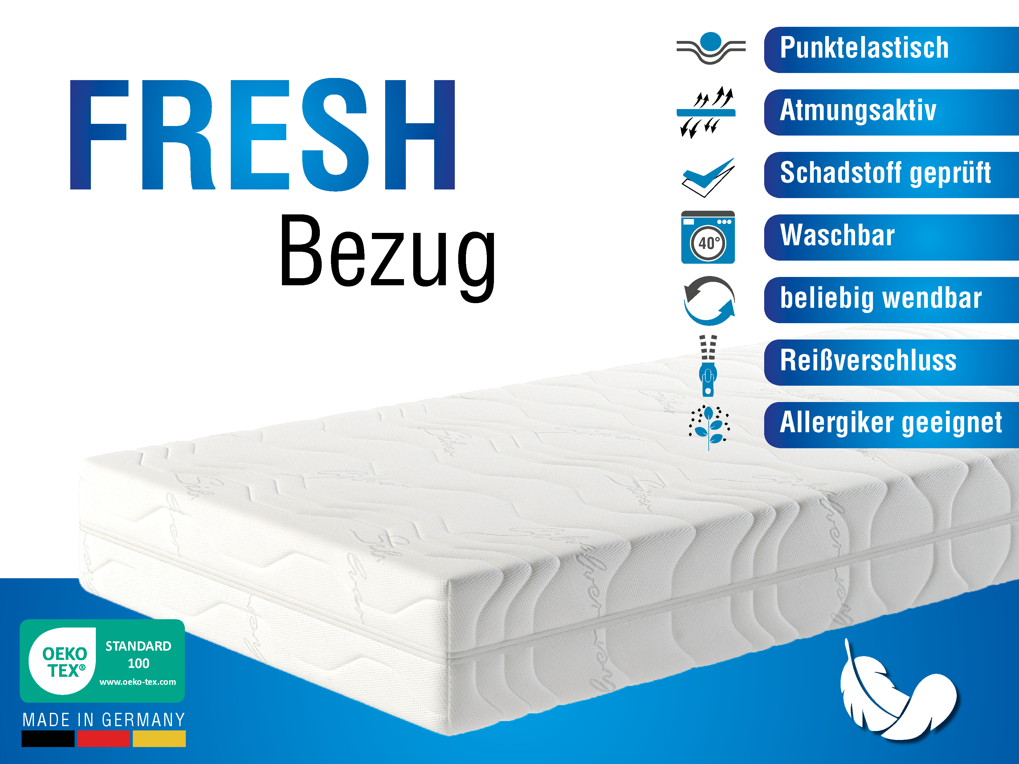 Der beidseitig mit atmungsaktiver Klimafaser versteppte Bezug sorgt für eine hervorragende Matratzenbelüftung. Waschbarer Bezug, pflegeleicht und hygienisch: Matratzenbezug durch 4-seitigen Reißverschluss rundum teil- und abnehmbar – maschinenwaschbar bis 40° C.